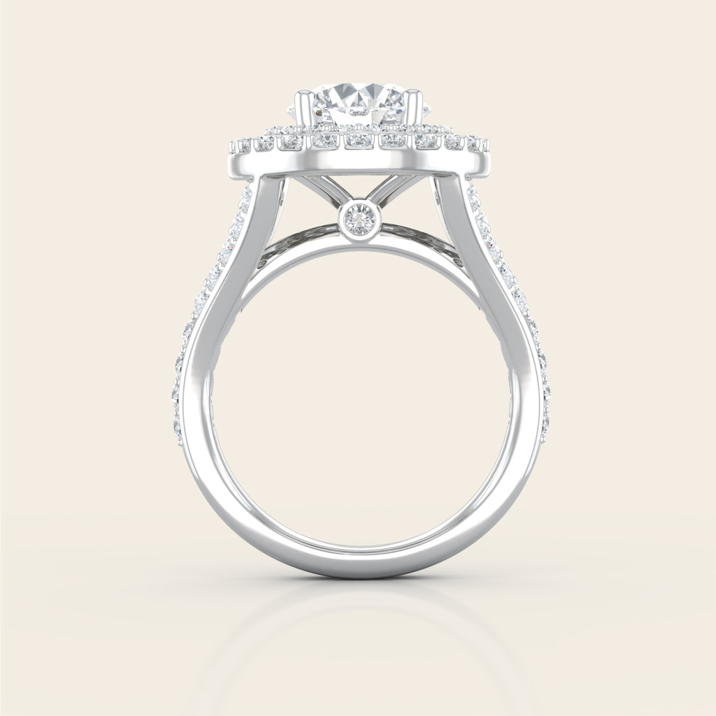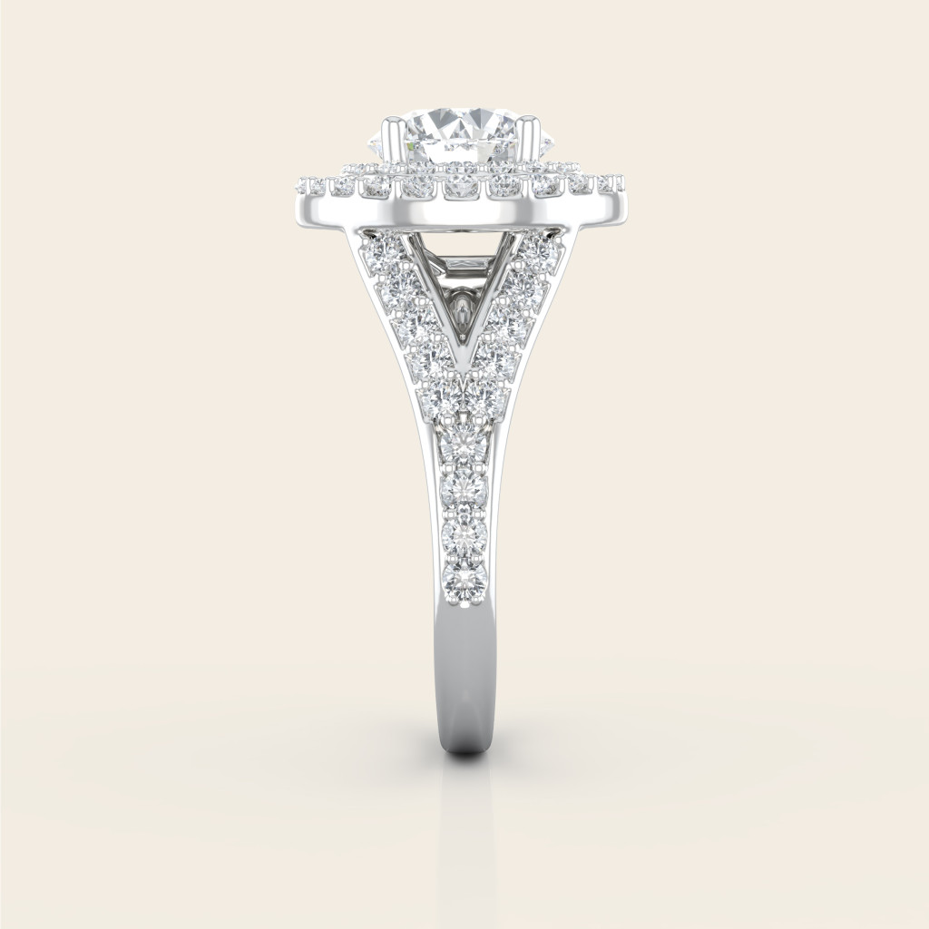 Zásnubný prsteň Alžbeta je majestátny šperk, ktorý spája eleganciu a luxus v jednom dizajne. Dominantný centrálny drahokam s okrúhlym brusom (0.50 ct) je obklopený dvojitým halo zloženým z desiatok menších drahokamov, ktoré umocňujú jeho žiaru a vytvárajú ohromujúci efekt iskry pri každom pohybe ruky.