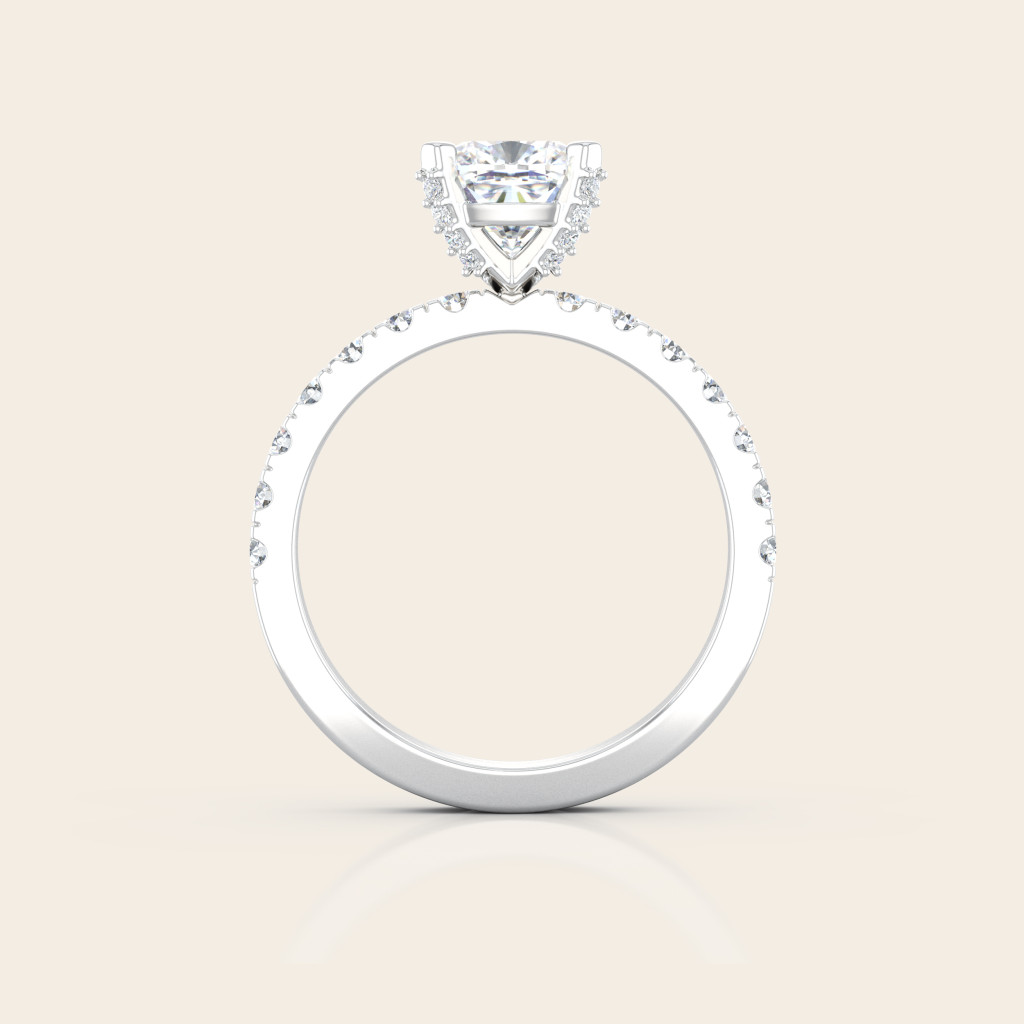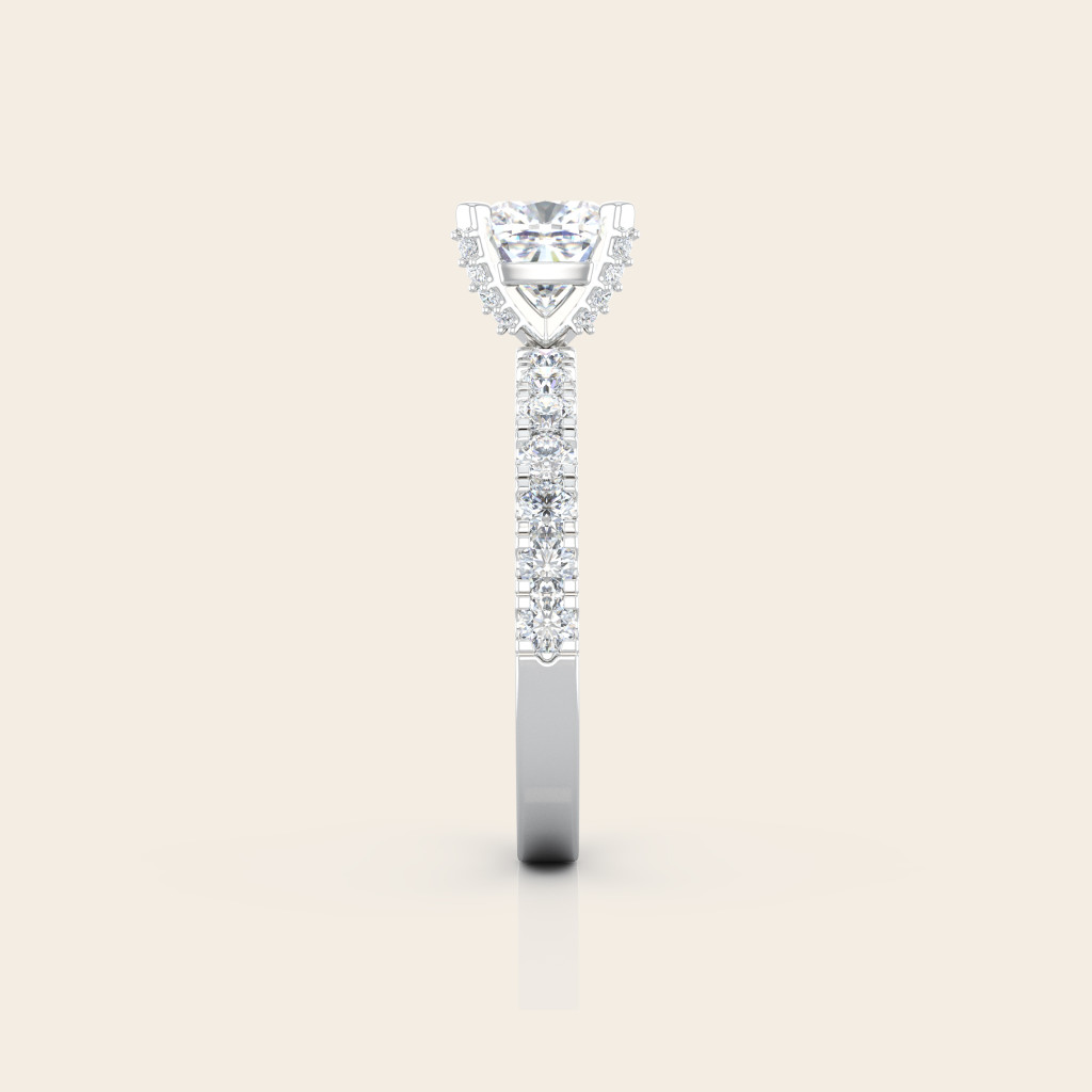 Zásnubný prsteň Beatrice je stelesnením noblesy a nadčasovej elegancie. Dominantou šperku je centrálny cushion cut drahokam s veľkosťou 1 ct, zasadený do štvorpramennej korunky, ktorá zvýrazňuje jeho brilantný lesk. Po stranách ho obklopujú drobné kamene osadené do obrúčky a korunke, ktoré dodávajú prsteňu žiarivú hĺbku a pôvab.